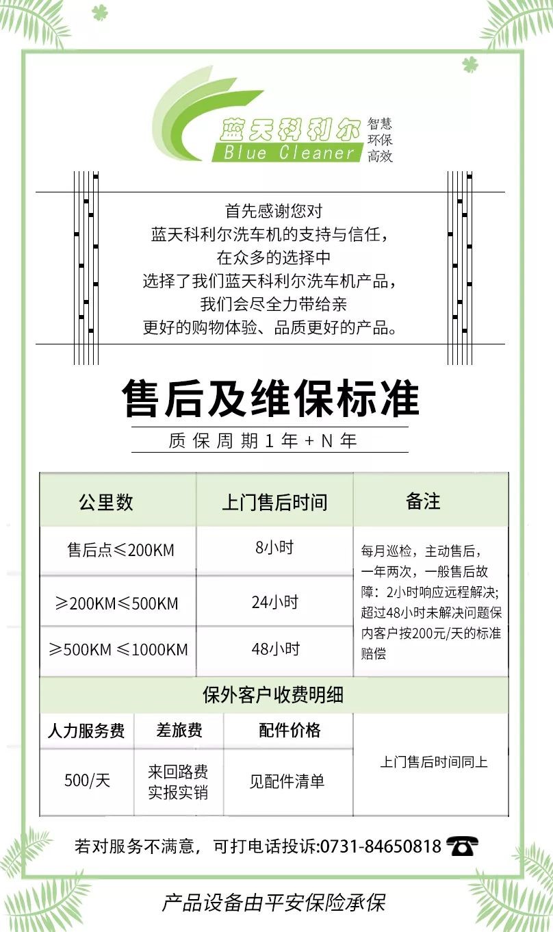 綜上所述:藍(lán)天科利爾洗車機(jī)是華中地區(qū)唯一的一家生產(chǎn)、銷售、售后一體的公司。在物流、安裝、售后等方面可以快速的響應(yīng),有非常好的區(qū)位優(yōu)勢(shì)。藍(lán)天科利爾全系列洗車機(jī)由平安保險(xiǎn)承保(詳見下圖售后及維保標(biāo)準(zhǔn))