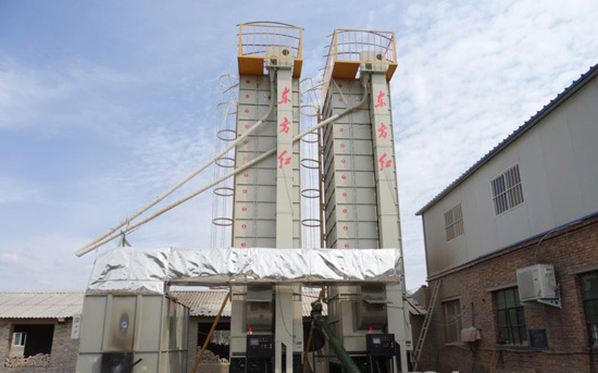 2臺東方紅5H-15循環(huán)式糧食烘干機(jī)正在進(jìn)行烘干作業(yè)